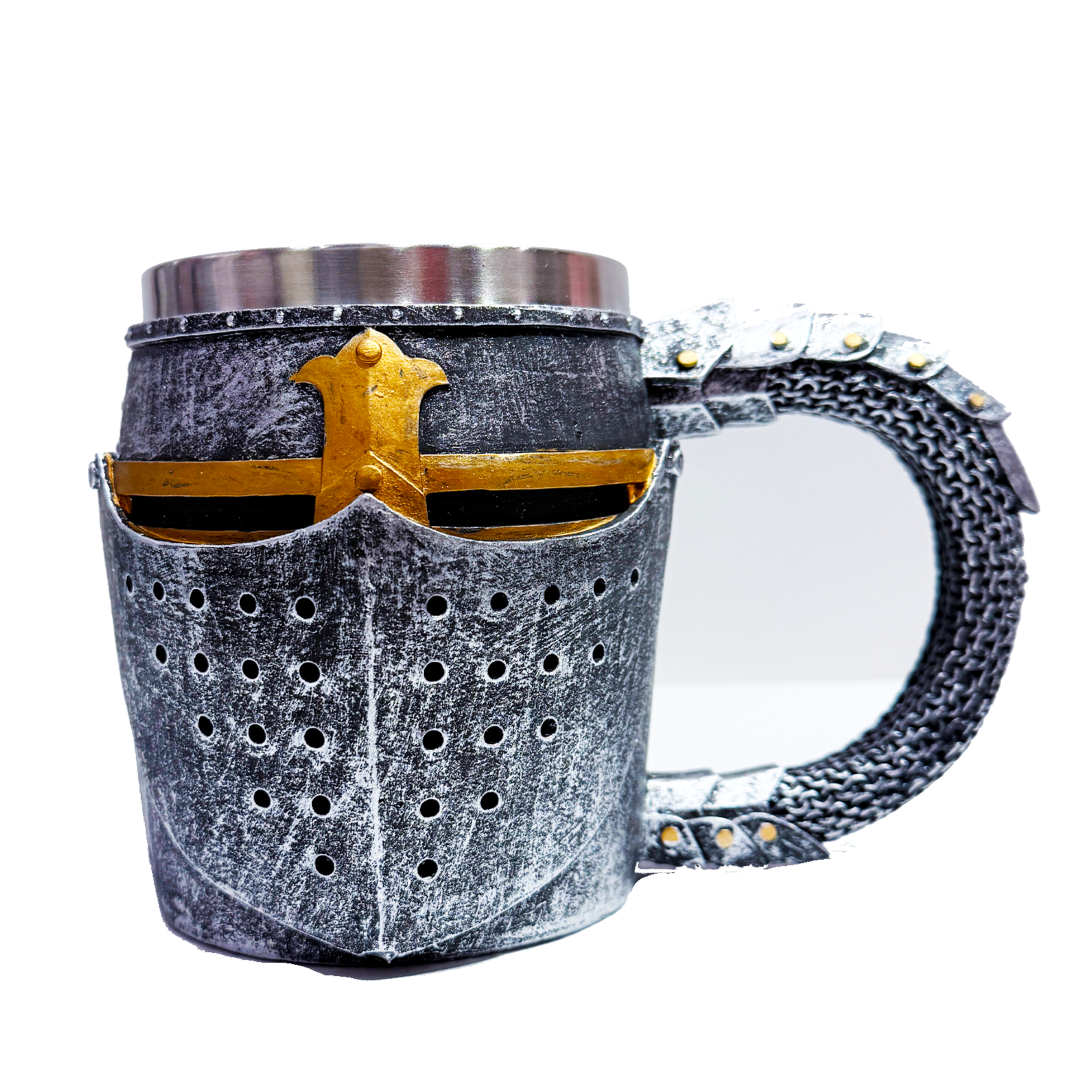 Channel the spirit of medieval warriors with the Decorative Medieval Helmet & Chain Mail Tankard. This impressive tankard is designed to resemble a knight's helmet, complete with intricate chain mail detailing, adding a unique touch of history and bravery to your collection. Perfect for displaying or using during themed events, this tankard brings an air of chivalry and adventure to any setting. A must-have for lovers of medieval history or collectors of distinctive barware!